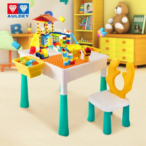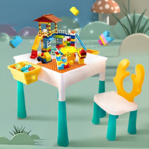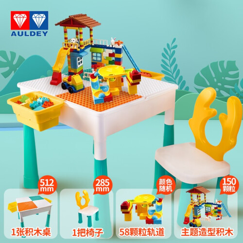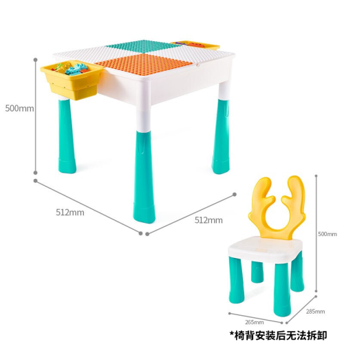 1桌+2椅+58轨道+150颗粒主题积木、一桌多用,满足不同年龄段需求。独特书架设计,可自由放置书本、平板电脑、画板等,孩子学习玩耍两不误。桌椅腿采用上窄下宽加粗设计,板面与颗粒积木间紧密贴合,大幅度倾斜板面,积木拼插不易坍塌。