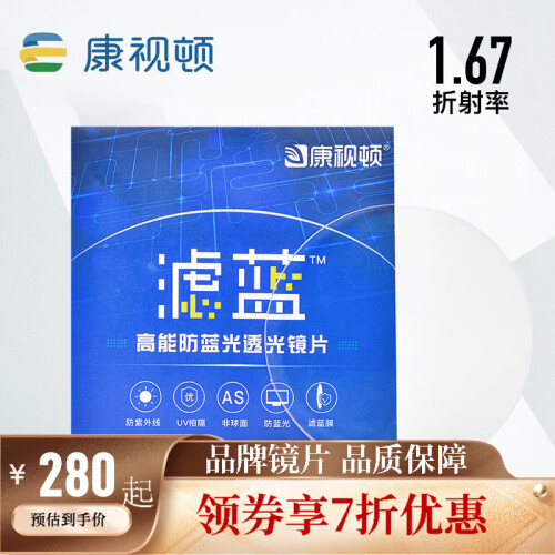 康视顿高清透明片膜层 1.67折射率高清镜片(可配0-800度近视0-200度散光的中高度近视患者)防尘,防灰,透光度更好。高性能膜层为不易沾水膜层,镜片遇液体后更易于清洁,不易沾染灰尘和水滴,表面手感光滑。