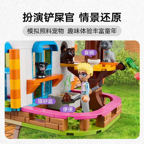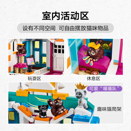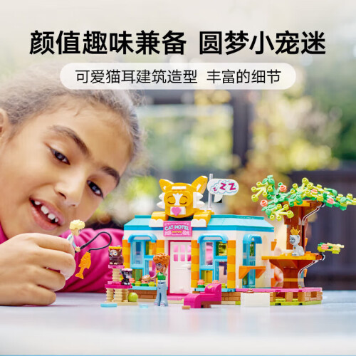 喜爱猫咪的孩子一定会喜欢上探索这款猫咪酒店 (41742) 拼搭玩具。本套装专为 6 岁及以上的孩子设计,包含 2 个迷你玩偶和 3 个猫咪角色,可以带来许多讲故事机会。孩子可以帮助奥利把他的猫咪安顿在酒店,酒店内设 3 个房间、沙发和猫树。奥利甚至还可以为猫咪制作蝴蝶结和王冠。户外也一样好玩,为猫咪准备了猫咪主题的标志、可供攀爬的树、供人出入的门和供猫咪使用的小门。本套装还包含许多其它配件,如小箱子、猫粮、玩具等,以便孩子表演猫咪护理。