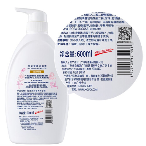 广州市好迪化妆品有限公司创建于1992年,是一家大型民营化妆品生产企业,主要生产洗发、护发、护肤、清洁、儿童等几大系列80多个品种产品满,“大家好才是真的好”这句广告词也是家喻户晓。这款亮采营养沐浴露,富含玫瑰植萃精华,沐浴同时温和滋养肌肤,香气自然,让肌肤持久留香。