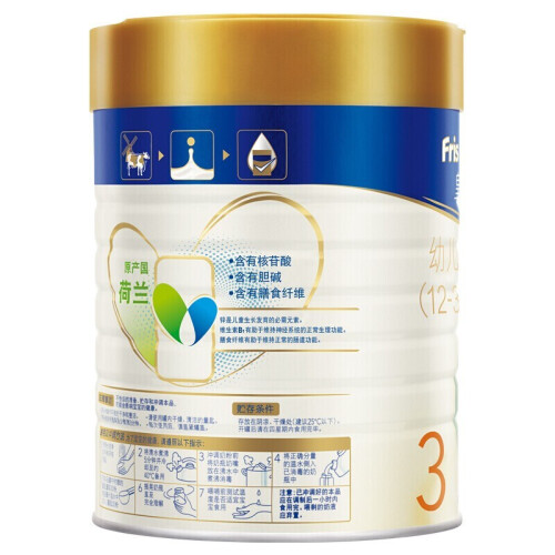 1879年在荷兰创建的Friesland Foods公司如今已是全球四大专业乳制品制造商之一,其出品的Friso美素佳儿系列更是享誉全球的专业奶粉品牌。这款奶粉新鲜直取皇家菲仕兰牧场的液态全脂牛奶,营养保持更全面,突破性自然保护配方,凝萃三大亲和乳脂营养,含有天然脂肪酸和乳磷脂,支持宝宝脑力发育。规格:800g。