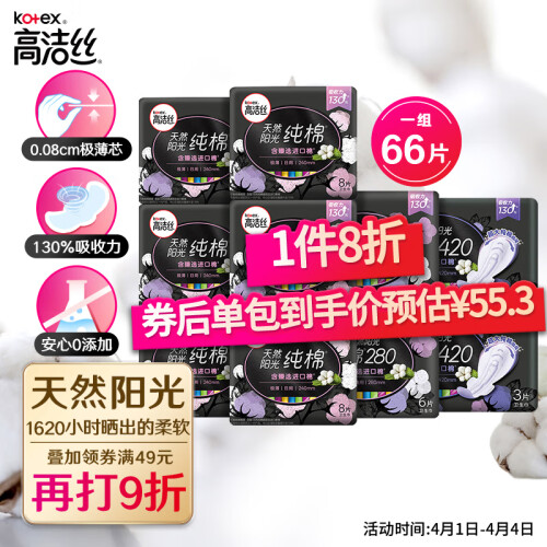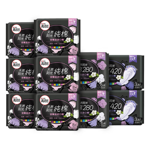 kotex 高洁丝 臻选系列 极薄绵柔卫生巾 迷你版,采用绒毛浆、无纺布、高分子吸收树脂、PE膜等制成, 贴身舒适,极薄质地,臻选纯棉超薄卫生巾日夜组合套装100片,240mm+280mm+420mm+150mm