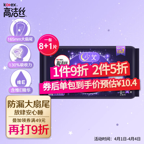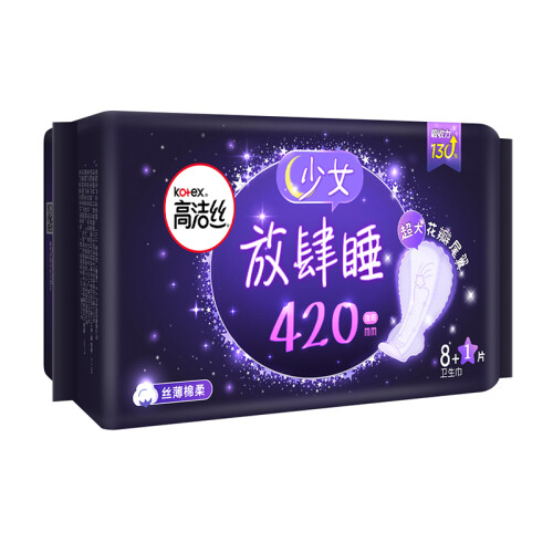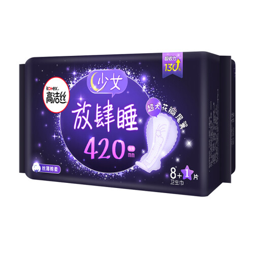 这款kotex 高洁丝 棉柔丝薄放肆睡卫生巾,为超长夜用型,采用绒毛浆、无纺布、PE膜和高分子吸收树脂的组合,能够在轻薄无负担的同时具有快速吸收的能力。主打贴体防漏,超薄巾身,轻薄透气,柔软面层舒适;尾部采用特大花瓣式包裹设计,安全不易漏,享受全包裹的安全感,贴身面层添加维E面层,呵护娇嫩肌肤,带来无摩擦感的柔滑体验。