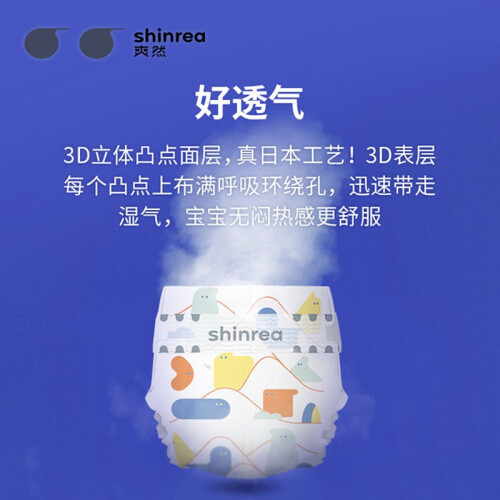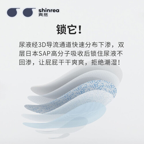 爽然是湖南爽洁卫生用品有限公司旗下品牌,成立于1999年,旗下有屁屁好朋友、小画家、糖果环球之旅等系列,此款屁屁好朋友超柔透气系列纸尿裤,采用日本工艺的3D立体凸点面层,每个凸点上布满呼吸环绕孔,使得空气循环流通,迅速带走湿气,无惧闷热。芯体采用第五代芯体,仅0.2cm薄,在不改变大吸量的前提下,选用了更轻薄柔软的材质,双层日本SAP高分子魔力吸水珠吸水量高达600ml,相当于宝宝6次尿量,尿液经3D导流后可快速分布下渗,锁住尿液不回渗,拒绝潮湿。腰围设计比常规尿裤宽10%,加宽腰围设计,柔韧弹力松紧,贴合宝宝身型不勒小肚肚。