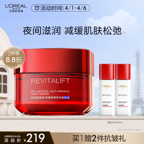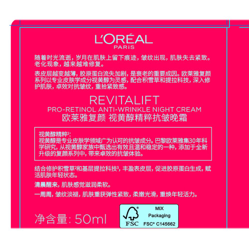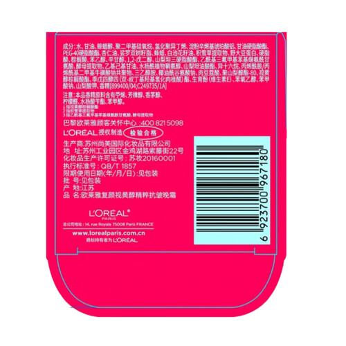 L'OREAL PARIS(欧莱雅)来自法国的彩妆护肤品牌,创立于1907年,是欧莱雅集团旗下大众化妆品牌之一,主要生产染发护发、彩妆及护肤产品。这款复颜视黄醇精粹抗皱晚霜,富含Pro-Retinol A(视黄醇棕榈酸酯),温和转化为视黄醇,可以有效淡化细纹, 增加真皮层厚度,提升肌肤的饱满度;专利科技Elastin弹力蛋白,其氨基酸组成与肌肤弹性蛋白纤维相似,能有效提升肌肤弹性,同时添加了95%高纯度的积雪草苷,能有效舒缓因肌肤干燥和老化产生的细小损伤,令肌肤从微观层面更加平滑健康,进一步减少皱纹。