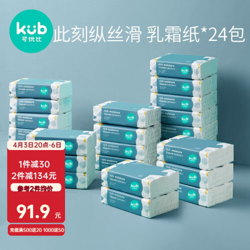 可优比婴儿乳霜巾新生儿超柔纸巾宝宝保湿纸巾抽纸100抽*24包,德国保湿因子,水润细腻呵护蛋白肌,柔软丝滑无屑的更适合婴儿肌和敏感肌。