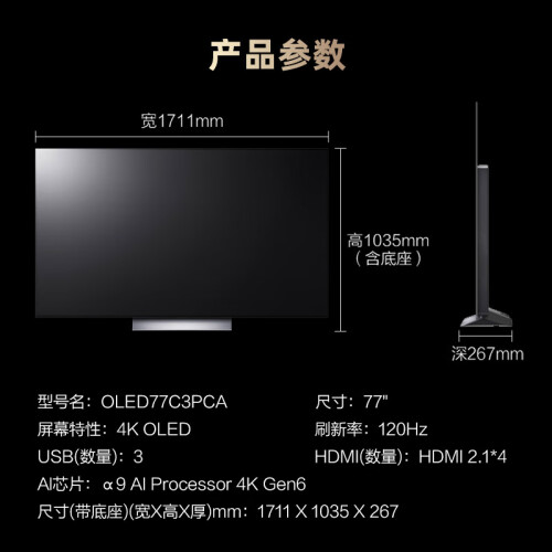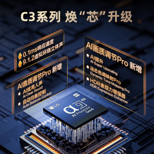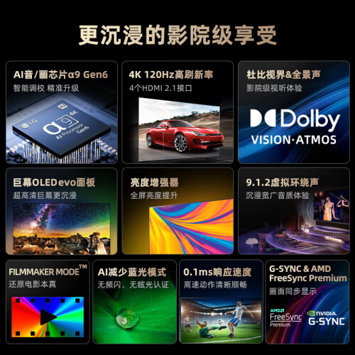 AI画质提升,处理系统使用AI降噪和AI解析对图像尽享分类,根据其类别去除噪点,并且通过深度学习算法优化人和物的清晰度,提升自然深度,从而获得更加逼真的图像质量。OLED动态色调摄射影Pro,HDR效果增强,AI音质调节Pro,亮度提升技术,更加明亮的OLED,多维支架,屏幕与扬声器的巧妙结合,100%色彩还原度和100%色域量。杜比视界。