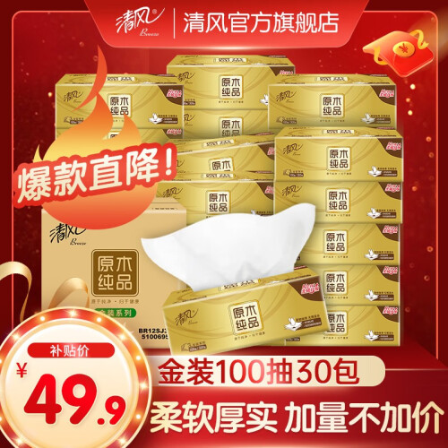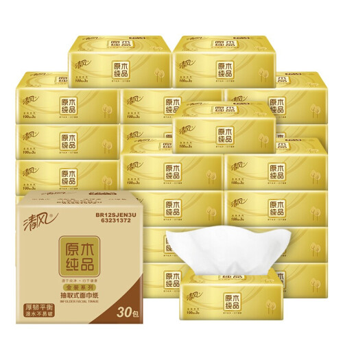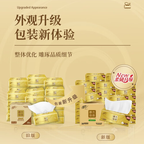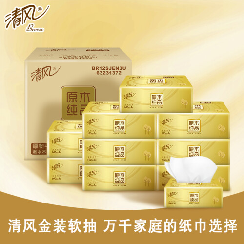 清风原木金装抽纸,柔韧升级,品质呵护,万千家庭的口碑之选;纸质柔韧升级,吸水力更大,柔韧兼备,湿水不易破;3层柔韧细滑,蓬松舒软,厚实与柔软的平衡体验;全程严控,更放心,不含可迁移性荧光增白剂;纤维紧实不掉屑不分层,纸质强韧,使用更放心。