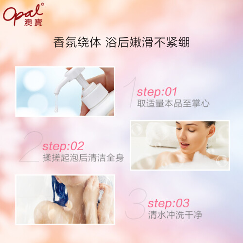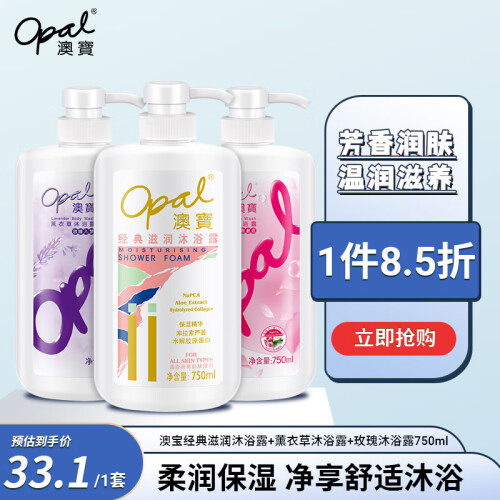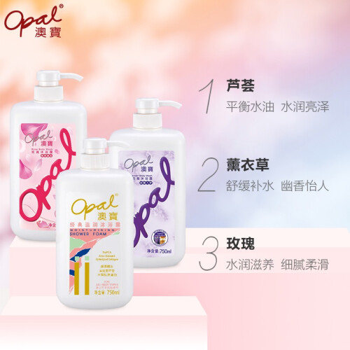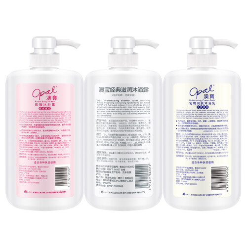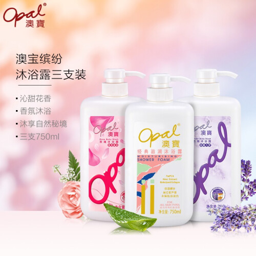 opal(澳宝)创立于1994年,隶属于澳宝化妆品(惠州)有限公司旗下,其产品包括洗发护发产品、沐浴产品、彩妆、个人护肤、儿童护肤、消毒产品等。这套沐浴露包含经典滋润沐浴露750ml+玫瑰沐浴露750ml+薰衣草沐浴露750ml,沐浴露使用后肌肤清爽不粘腻,无厚重感,易吸收。