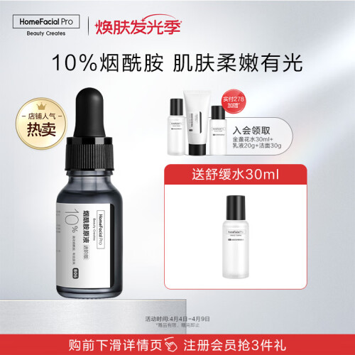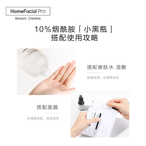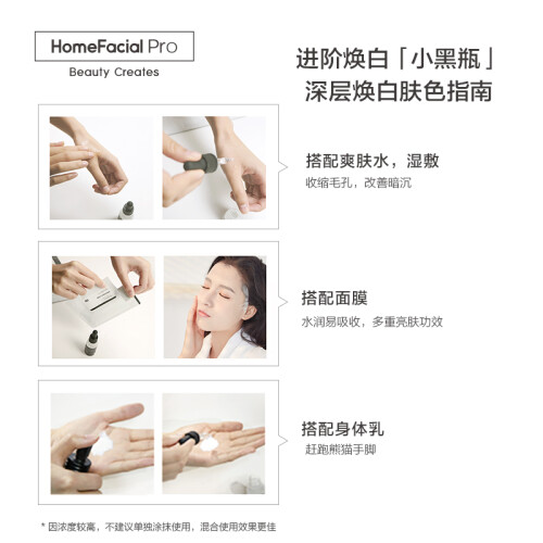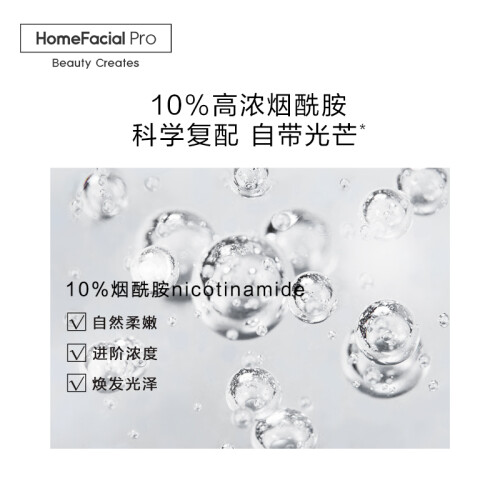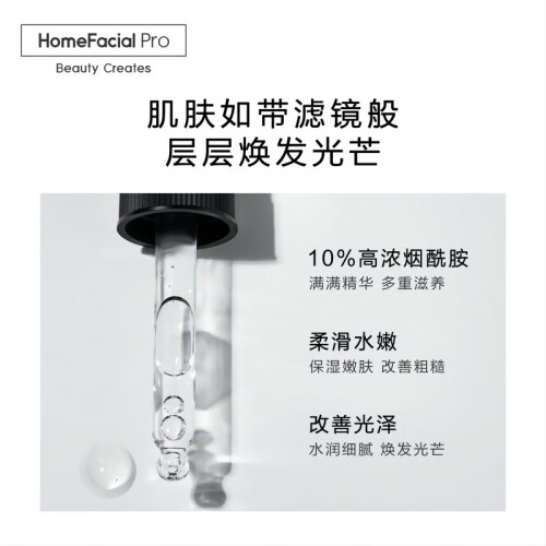 HomeFacialPro推出的这款精华液,内含烟酰胺、β-葡聚糖、野大豆籽提取物等成分,可帮助缓解黑色素,补充肌肤水分,提亮、均净肤色。精华液可单涂使用,也可搭配面膜、乳霜等产品使用。适用于多种肤质。