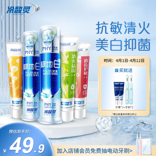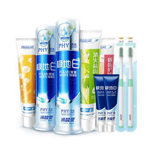 冷酸灵 全家福牙膏专业抗敏5支套装包含:极地白泵式牙膏(海洋薄荷香)130g*2、盐白抗敏牙膏(冰爽薄荷香)180g、清火护敏牙膏(清新薄荷香)180g、茶醇清新牙膏(茉莉花香)180g。精选温和磨粒,不伤牙釉质。