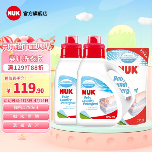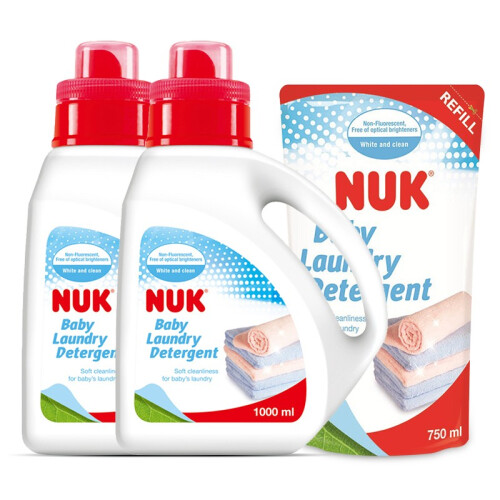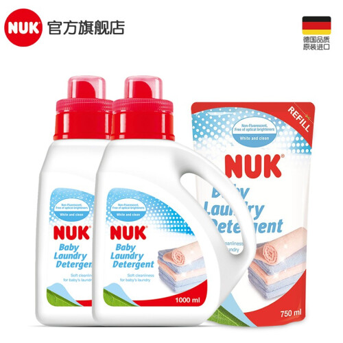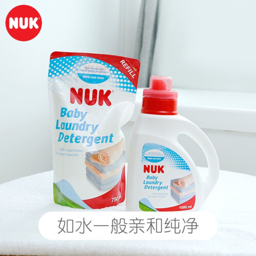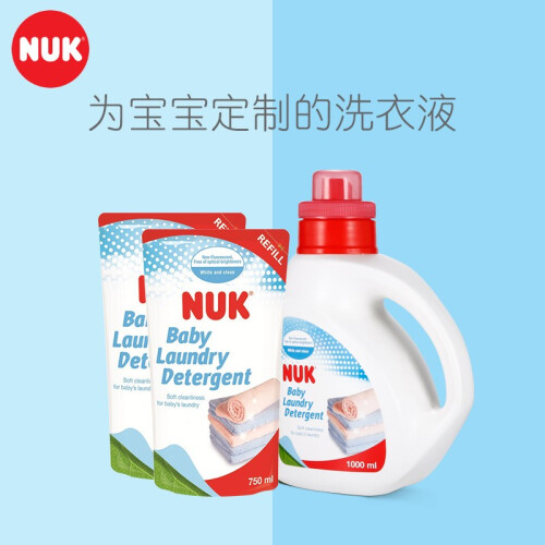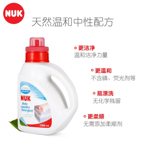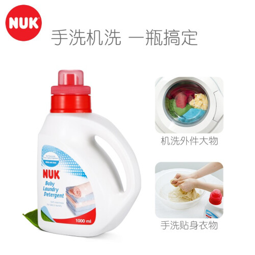 NUK 婴儿洗衣液,产地台湾,主要成分为特殊洗净界面活剂和抗菌剂,不含磷、荧光剂、漂白剂等,酸碱值为中性,温和不伤手,洁净力强,易于漂洗,衣服洗后柔软舒适,尤其适用于婴幼儿的衣物,1000ml袋装。