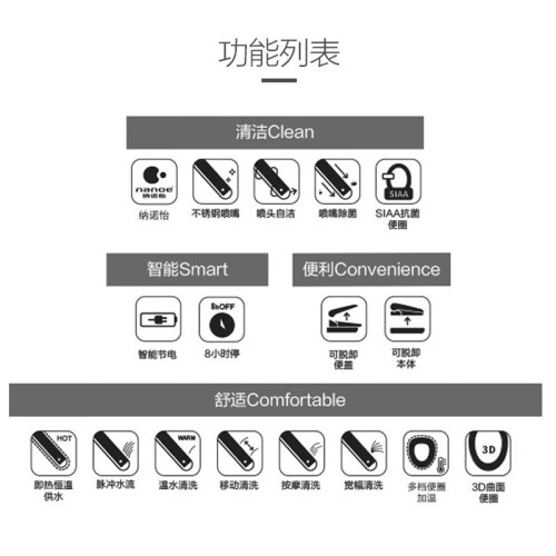 本款马桶盖采用纳诺怡技术制作,可有效抵御90%细菌,给您更加洁净的如厕体验。内部使用日本进口陶瓷加热芯,即热式出水,干净卫生。支持3档水温和水流强度调节,搭配4大清洗模式,满足您的个性化需求。3D曲面便圈结构,充分贴合人体曲线久坐更舒适。