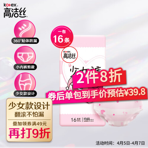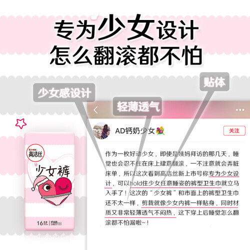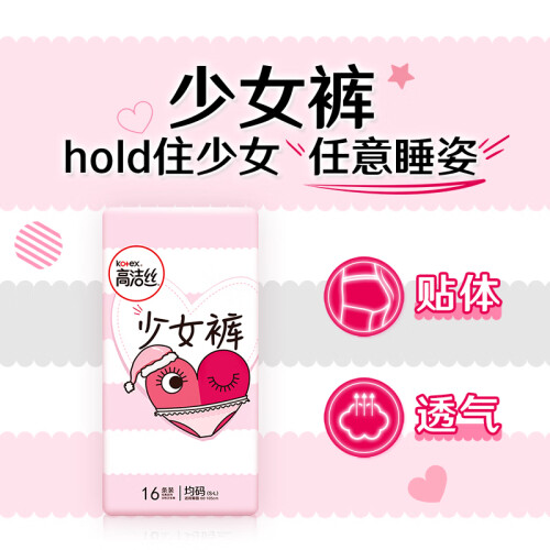 kotex 高洁丝 少女裤 超薄贴身裤型卫生巾,裤型设计,主打贴体防漏,超薄巾身,轻薄透气,柔软面层更舒适。量多时期使用,也安全不易漏。