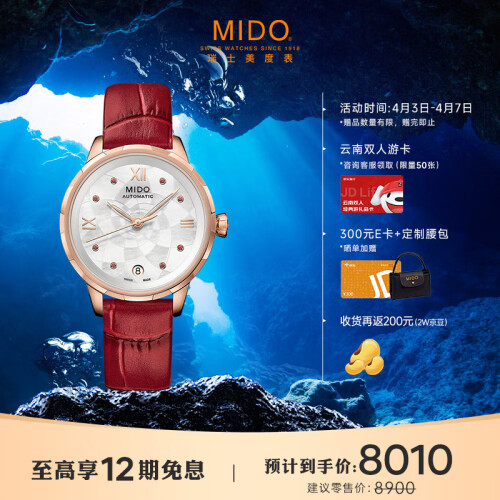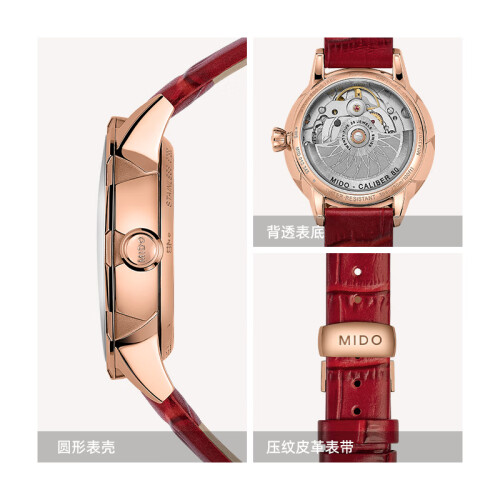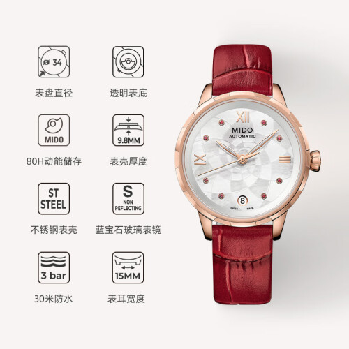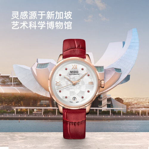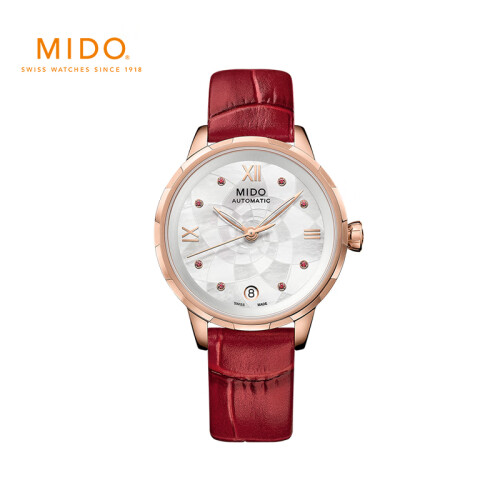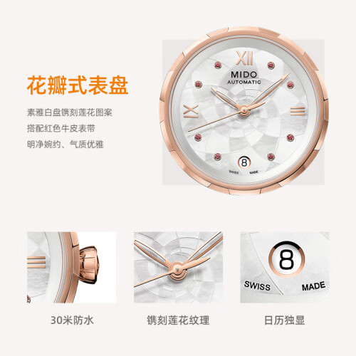此款产品为MIDO 美度 花淅系列 女士自动机械腕表 M043.207.36.118.00,灵感来源于新加坡艺术科学博物馆艺术和科学相融合的恰到好处,美丽的弧线宛如一朵盛开的莲花,灵感塑造美好世界。表盘采用白色珍珠母贝打造,中央饰以盛开莲花图案。不锈钢表冠方便校准对时。皮质表带,质感柔软舒适,贴合手腕佩戴舒适,展现腕上品牌风采。