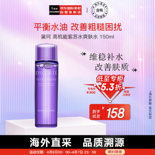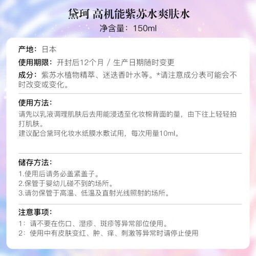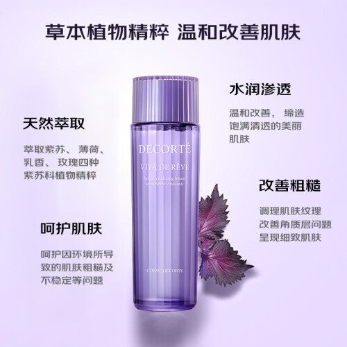 黛珂(COSME DECORTE )诞生于1970年,集团*级品牌,由KOSE创始人小林孝三郎先生所亲自开创。COSME DECORTE,这个美好的名字来自法语cosmetique与decoration,寓意着【美的勋章】,也是高丝(Kose)旗下最*级的品牌。这款COSME DECORTE 黛珂紫苏保湿水,玻璃瓶身质量很好,添加了紫苏科植物精华,对换季敏感或者受环境侵害的肌肤提供呵护,维持肌肤稳定,湿敷有去闭口的效果。无合成界面活性剂、无油分,敏感肌肤也适用。