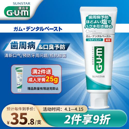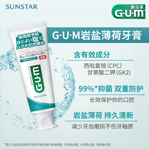 SUNSTAR是日本知名齿科财团,专注口腔与全身健康的科学课题已超过半个世纪,旗下口腔护理类产品远销世界80多个国家和地区。这款活效牙周护理牙膏,专为牙周松动和炎症出血问题设计,获得了厚生省药用级别认证,通过颗粒结晶盐对牙龈进行收敛紧固,减少牙齿松动,防止食物残渣进入牙龈和齿面缝隙引起的结石和炎症。