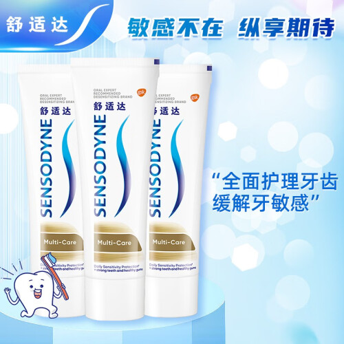 SENSODYNE舒适达为葛兰素史克旗下品牌,自1961年起始终致力于提供有效治疗牙本质敏感症状的方法,是专业的抗敏感牙膏品牌。和普通牙膏相比,舒适达牙膏用量很少却可以达到抗敏感的目的和效果,故定价较高。这款牙龈护理牙膏可有效缓解牙齿疼痛、抑制口腔细菌滋生、坚固牙釉质,针对牙齿敏感导致的不适,效果不错。多效护理为全面护理的新包装,同时在市面上销售。
