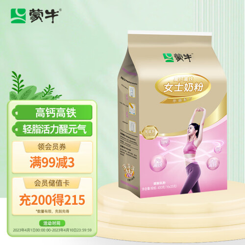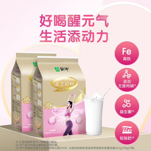 蒙牛(MENGNIU)的这款高钙高铁女士奶粉,配料为全脂乳粉、脱脂乳粉等。每100g奶粉中含铁量为7.8mg,含钙量为1100mg。建议取25g奶粉配以200ml左右温水冲调饮用。本品不适宜牛乳蛋白过敏者或乳糖不耐受者。袋装包装,卫生防潮。保质期24个月,建议置于阴凉干燥处储存。