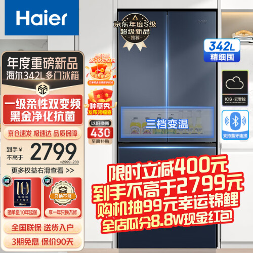 当前的位置: 首页 > 今日值得买 > 海尔(Haier)冰箱342升一级能效双变频风冷无霜双开门四开门法式多门三档变温家用家电净味超薄嵌入式智能旗舰 342升星石蓝+1级双变频+黑金净味+冷藏三档变温
