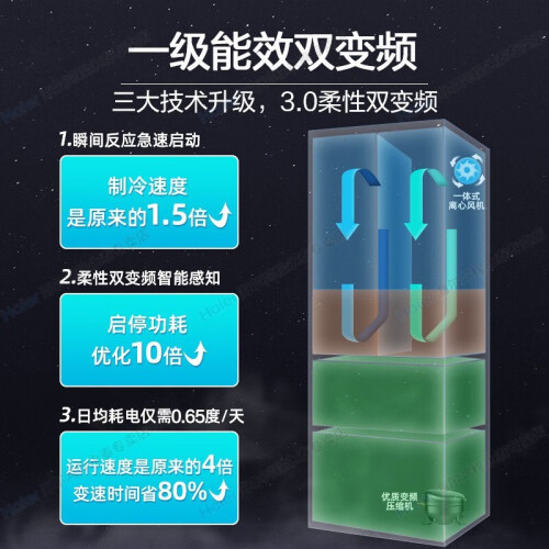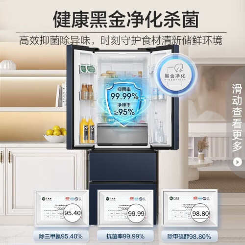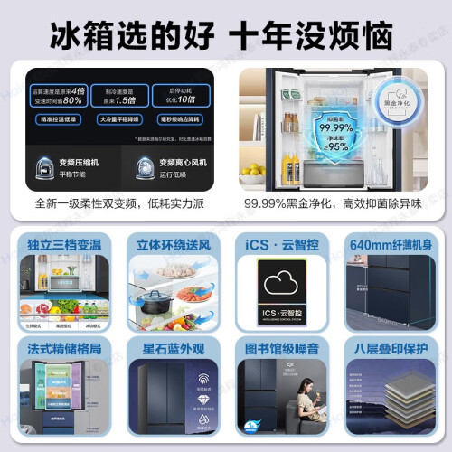 全新一级柔性双变频】0.65度/天,节能低耗;35分贝低噪,恒稳运行;低耗实力派,双循环双变频,节能环保“芯” 【独立三档变温】生鲜、果蔬、冰镇,三种储鲜模式匹配不同食材所需,美食生活轻松拿捏。 【健康黑金净味】物理活性成分高效抑菌、除异味,抑菌率99.99%,净味率≥95%,时刻守护食材清新储鲜环境。 【360°立体环绕送风】立体环绕送风,制冷均匀,保鲜食材不留四标,轻松享受生活舒适。 【手机WIFI智控】连接海尔智家APP,新鲜状态随时掌握,指尖轻触美味达成。 【抽屉式收纳】冷冻双层直开抽屉,顺滑一拉到底,取物更快更便利。 【纤薄机身】640mm纤薄设计,灵巧融入橱柜“隐身”不占地,小厨房内轻松摆。 【治愈系星石蓝外观】灵感源于斯里兰卡的星光蓝宝石,平静而舒缓的基调,满满治愈感,百搭契合厨居。