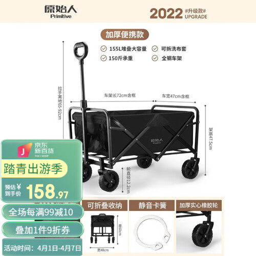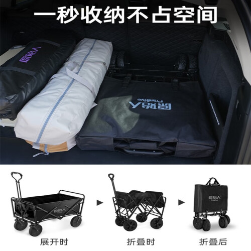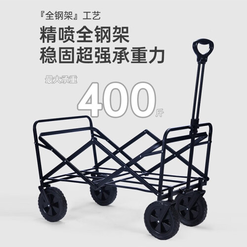强大承载力,可达400斤。升级加粗,全钢车架,受力均匀拉动更稳固。4-6人露营装备,一车就能装。加厚实心静音轮,减少阻力适用多种地形。上坡不费力,推拉都省力,内置转向压力轴承推拉轻松顺滑。