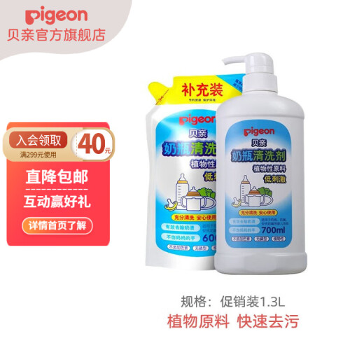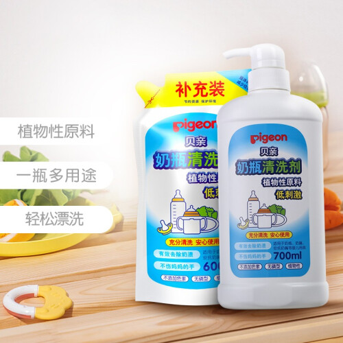 Pigeon/贝亲 奶瓶清洗剂,蕴含植物的清洗成份和食品中也使用的成份,能安心用于奶瓶、奶嘴、小玩具等婴幼儿入口之物的清洗。 有效清洗奶渍、唾液等婴幼儿特有的污垢,去泡快速,漂洗容易。 弱酸性配方,对哺乳器具,小玩具等婴幼儿入口之物无影响,温和不伤手。 规格:700ml