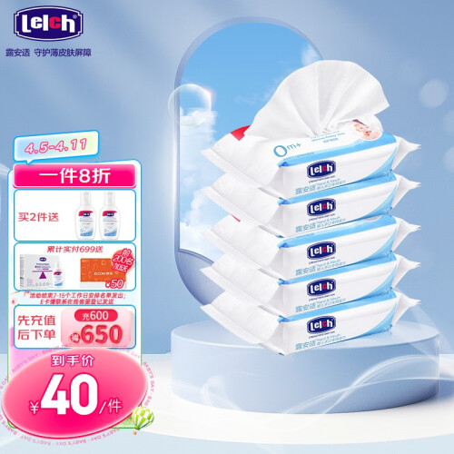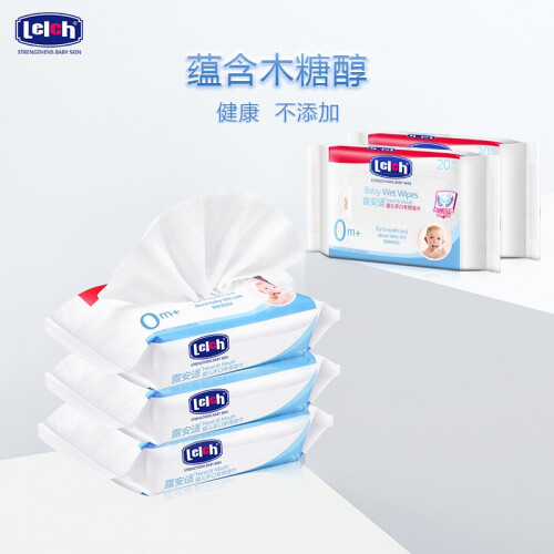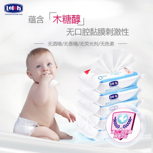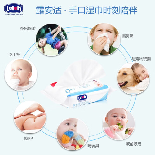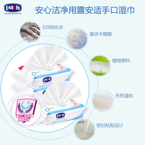 lelch 露安适 婴儿手口专用湿巾,欧洲EDI超纯水设备,水质纯净,不含杂质,含木糖醇植物配方,安全呵护口腔健康。湿巾液体由食品级原料配制而成,湿巾的液体主要由植物的原料配制,可安心使用。温和天然,没有色素添加可言。无色素、无酒精、无香料、无荧光剂,可适用于婴幼儿口腔、牙床、唇部、小手、餐具及其他易放入口中的玩具等清洁。方便的密封粘贴设计,方便使用,保持水分。每片湿巾规格是15×14cm,相当于一次性小毛巾。湿巾外出方便携带,可随时清洁宝宝手口和小屁屁。冷热两用,秋冬季节把湿巾放在热水里泡一下再擦拭,不担心冻到宝宝娇嫩肌肤。