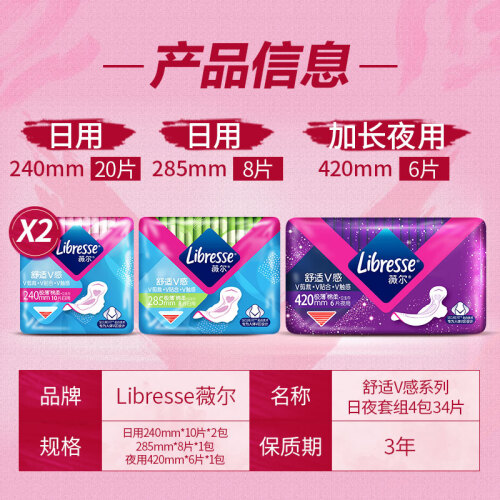 这款Libresse 薇尔 日夜卫生巾组合34片装,包含日用240mm*10p*2+加长夜用420mm*6p+极薄瞬吸棉柔 285mm*8p。Libresse 薇尔,瑞士品牌SCA旗下品牌之一,已经有70多年的历史。行销全球62个国家,在欧洲、南美洲及东南亚均是女性护理用品市场领导品牌。严格执行欧盟标准,拥有自己的专利号。这款绵柔超薄防漏塑形日用卫生巾,采用独特的燕尾剪裁,漏斗形瞬吸网络,可以快速吸收侧漏,并防止从后方与边缘溢出,全方位守护。