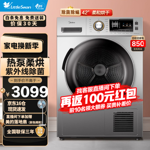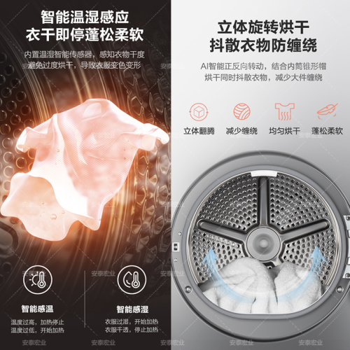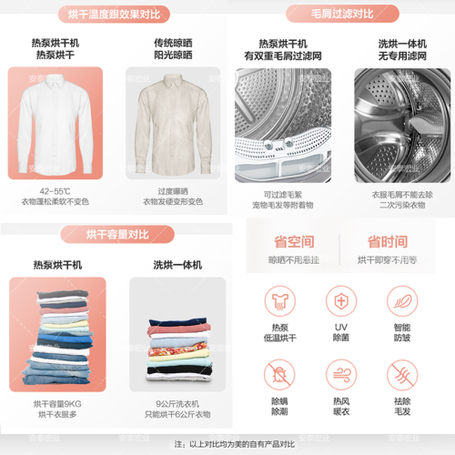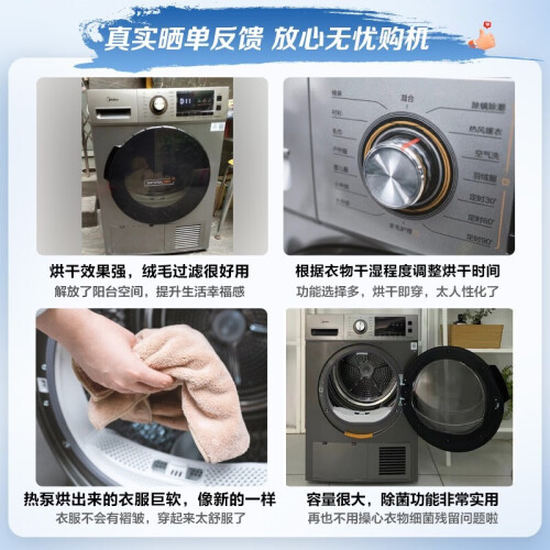 美的(Midea)这款型号为MH90-H03Y的干衣机,采用了节能高效的热泵式烘干,烘干容量9公斤,配备有多达9种烘干模式,满足多样使用需求。内置UV杀菌灯,搭配不锈钢内筒的镜面反射,可达到对内桶衣物99.9%的除菌。配备有双重毛线过滤网,以避免毛屑进入冷凝器,影响烘干能力。配备有温湿智能传感器,实现衣干即停,避免过度烘干,具备AI智能正反转,有效避免衣物缠绕。