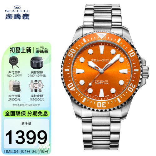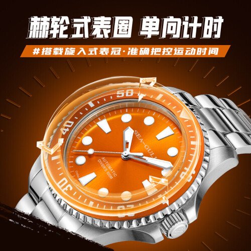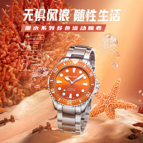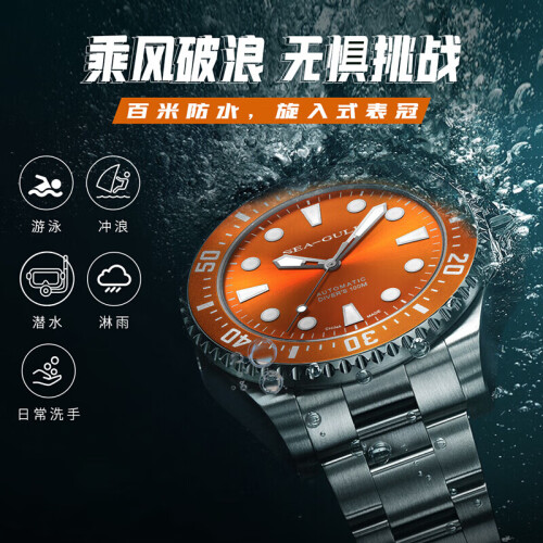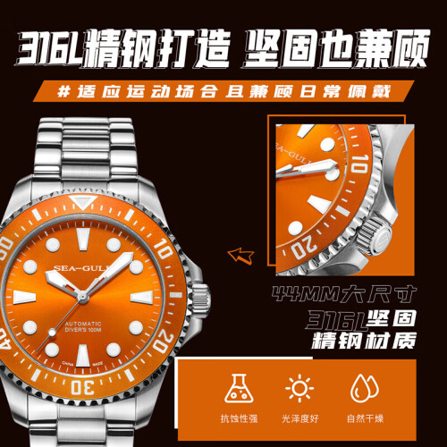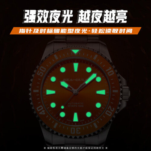 海鸥的815.97.6105手表是100m防水机械潜水表,表距45mm,外壳为316L精钢表壳,有着夜光刻度与指针。搭配中国自主研发的ST25机芯,动力可储存40h,由25颗红色宝石轴承,摆动频率可达21600次每小时。表镜材质为人工合成蓝宝石镜面,硬度高,能够抵挡一般的划痕伤害,拥有夜光功能的它在夜晚时也能发出盈盈光芒。