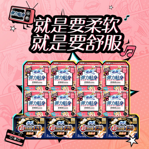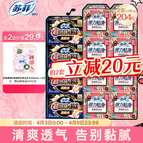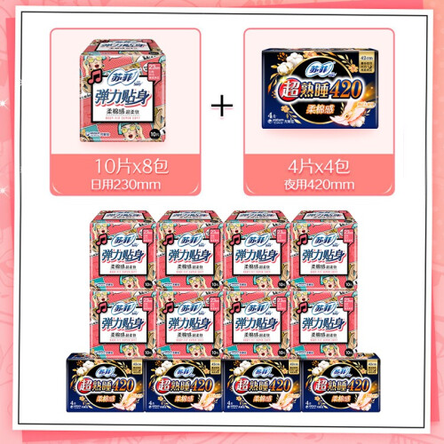 苏菲卫生巾,于日本开发,是尤妮佳公司针对现代女性推出的卫生巾品牌,提供优质的卫生巾、护垫产品,适应现代女性需求的多样化,高端化。此款卫生巾组合套装弹力贴身纤巧日用230mm 10片*8包+超熟睡柔棉感夜用420mm 4片*4包。