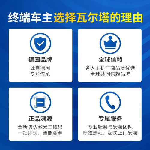 瓦尔塔,百年历史品牌,创立于德国,品质的保证。瓦尔塔蓄电池来自全球主要的蓄电池生产商世界500强江森自控,2016年为全球整车厂商和售后市场提供约1.52亿只蓄电池。是众多合资和国产中高端品牌汽车蓄电池的原厂配套产品,满足国内中高端主流车型的需求。瓦尔塔独具的PowerFrame倍伏锐专利板栅技术,导电性及耐腐蚀能力较传统板栅技术大幅提高。