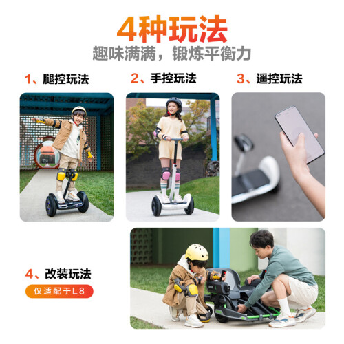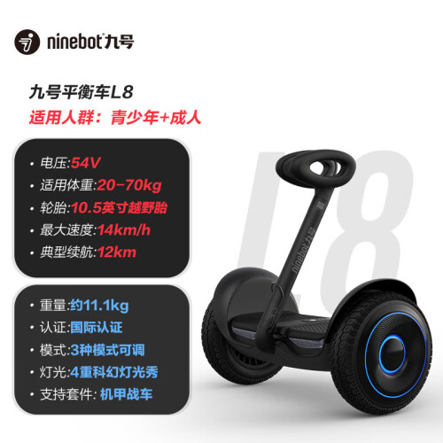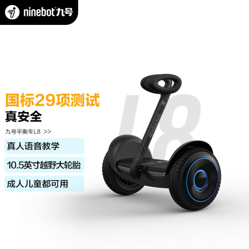 Ninebot 九号 平衡车 L8 黑色 ,经过国标29项严苛测试,九号集成控制系统2.0,更稳定。智能自学习算法,适应你的骑行习惯,越骑越懂。自动识别路障斜坡,调整功率,轻松通过。15重安全保障,全方位守护你的骑行。语音系统1对1教学,实时安全提醒。续航12公里。