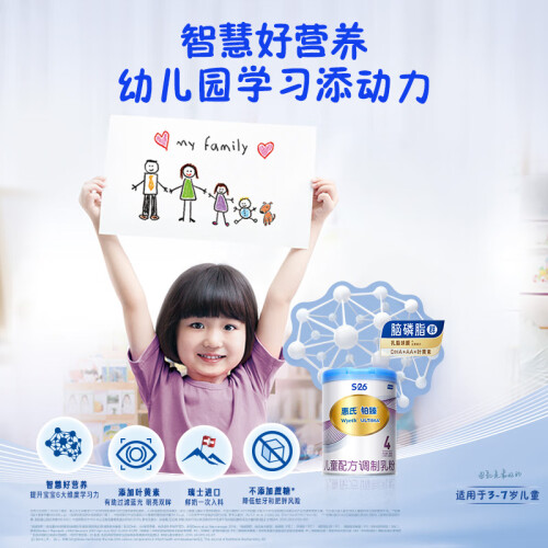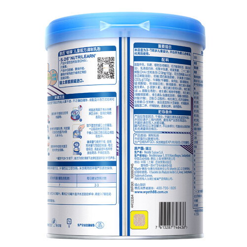 Wyeth 惠氏是著名奶粉品牌,在婴幼儿营养品的研制和营销方面有着近百年历史,这款s-26铂臻系列奶源100%为瑞士原装原罐进口,来自于生活在海拔1840米阿尔卑斯山生态区的奶牛,从而确保纯净,特别添加5大重要磷脂,协同DHA、AA等营养共同发挥作用,帮助宝宝大脑神经元网络化发育,含有牛磺酸、叶黄素、DHA、维生素D、低聚半乳糖等多种营养,能够补充宝宝在日常的饮食中不能获取或是获取不足的各种营养,优质乳糖配方,不添加蔗糖白砂糖,有助于宝宝养成良好饮食习惯。