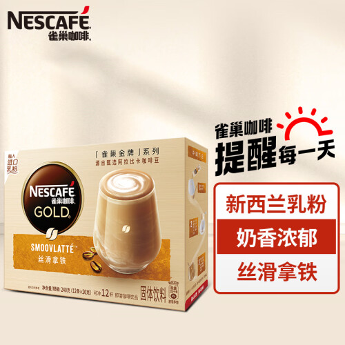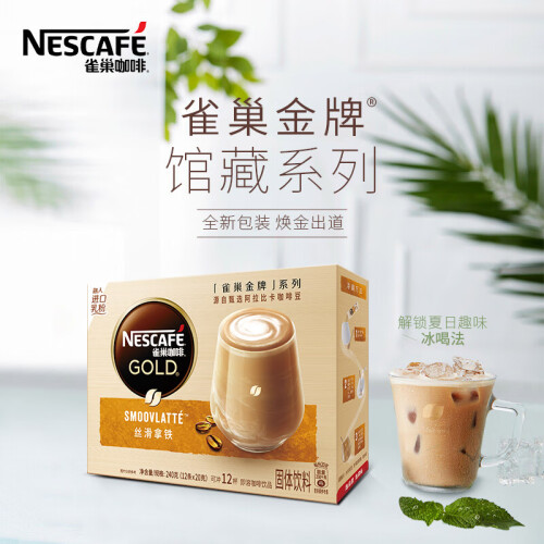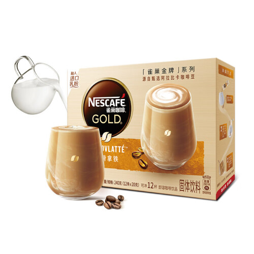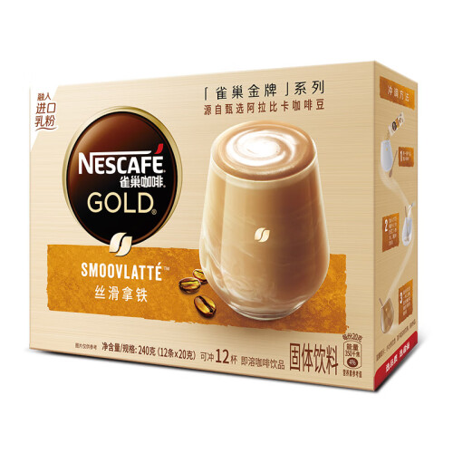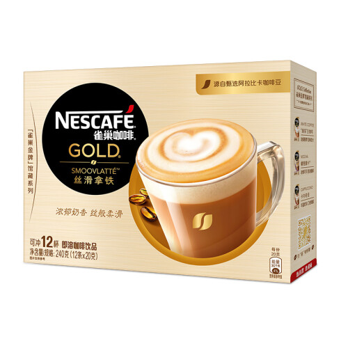 雀巢金牌 GOLD 馆藏系列是雀巢速溶咖啡的高端系列,在同类速溶咖啡产品中品质颇佳,也有着不错的口碑。金牌拿铁咖啡奶味较浓,这源自其中不低于30%的新西兰奶粉,速溶咖啡中50%以上来自高山阿拉比卡咖啡豆,此外还加入了无水奶油。规格:20g*12条。