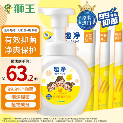 当前的位置: 首页 > 今日值得买 > 狮王(Lion)趣净泡沫抑菌洗手液清爽柠檬香型(250ml*1+200ml*3)原装进口