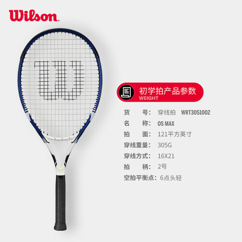 Wilson网球拍是国际市场占有率最高的网球拍品牌,著名产品系列为:hammer(榔头系列),pro staff(明星系列),ROLLERS(威轮系列),TRIAD系列。此球拍是 WRT3051002Wilson威尔胜初学者网球拍,轻量舒适 控制性佳,非常适合初学者。