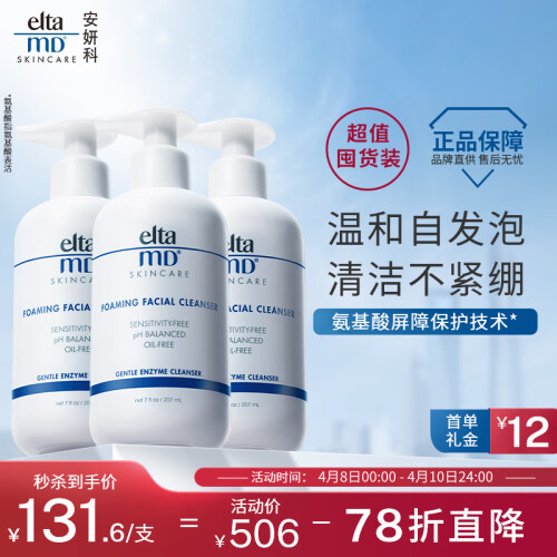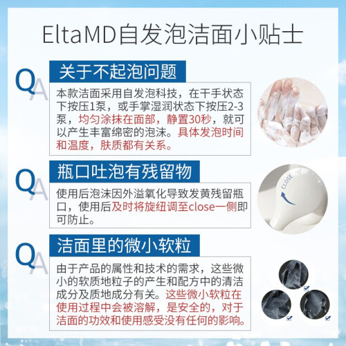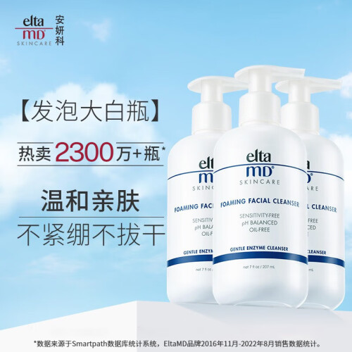 Elta MD氨基酸泡沫洗面奶,不含果酸、添加剂、防腐剂和皂基,弱酸性均衡PH值配方对肌肤无负担。独特的自发泡功能,挤在手心就会自动产生泡沫,配合转圈的涂抹手法,可以大大增加泡沫的饱满绵密度,温和清洁油脂和污垢,不带走皮肤多余的水分,洗后不紧绷、不伤害肌肤皮脂。洁面的同时可以卸妆、防晒霜和隔离霜等。洁净毛孔中的污垢和多余的油脂、温和亲肤,痘痘肌、敏感肌同样适用。