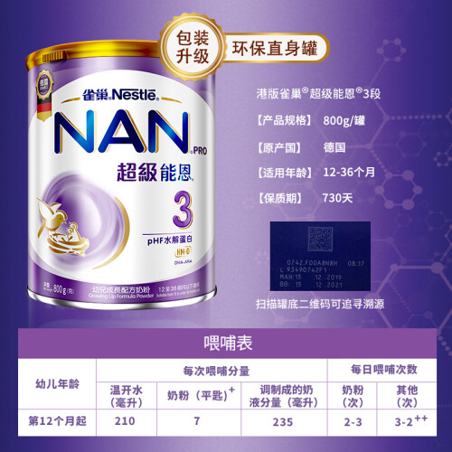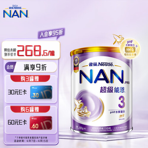 雀巢是世界知名的奶粉品牌,旗下系列包括雀巢超级能恩、雀巢能恩、雀巢特殊配方奶粉等。其推出的这款超级能恩系列特殊配方奶粉,使用pHF水解技术,针对蛋白质中的致敏原进行切割,有助降低牛奶蛋白致敏性,小分子更易吸收,降低宝宝出现过敏反应。特别添加母乳低聚糖HMO,亲近宝宝营养需要,提高肠内益生菌活性,帮助宝宝提升源生保护力,增强免疫力。富含钙、铁等多种矿物质和维生素,全方位守护宝宝茁壮成长。