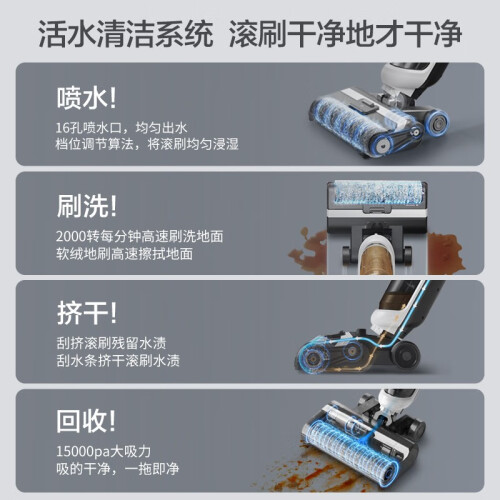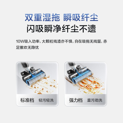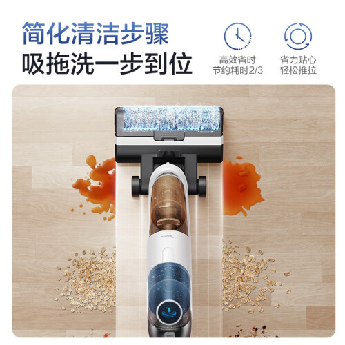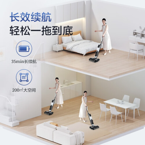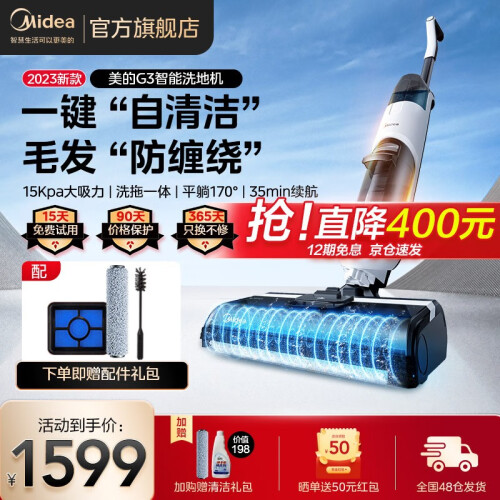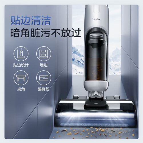 美的(Midea)这款型号为G3的的洗地机,拥有传统洗地机的“吸拖洗”三种功能,其中吸力最高可达10W,带来了不俗的清洁力。产品标配软绒滚刷,可深入缝隙,不伤地板,不易缠毛发。地面瓷砖,木地板皆可适用,边角污渍、厨余垃圾通通不在话下。为方便使用,产品具备自驱力,可自驱助推前行,搭配整机3.95KG的自重,轻松使用更省力,灵活穿堂入室,老人单手也能轻松驾驭,清洁不费劲。配备有600ml清水箱+400ml污水箱,搭配2500mAh强劲锂电,大水箱35min长续航,轻松清扫全屋,一气呵成。搭配专研定制清洁液,有效清除99.9%常见细菌,温和清香不伤地板。产品在保证性能同时降低噪音输出,噪声低至74dB(A)。便捷存取节省空间,充电收纳二合一,占地约为14寸iPad,为家居释放更多空间。