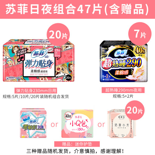 Sofy苏菲推出的这款卫生巾套装,包含日用款和夜用款。均选用棉柔表层,弹力合宜,触感柔软舒适。日用款厚度较薄,可保持肌肤清爽,方便日常活动。夜用款采用蝴蝶扇尾设计,可预防后漏。采用锁芯技术,量多也能快速吸收,并牢牢锁住。
