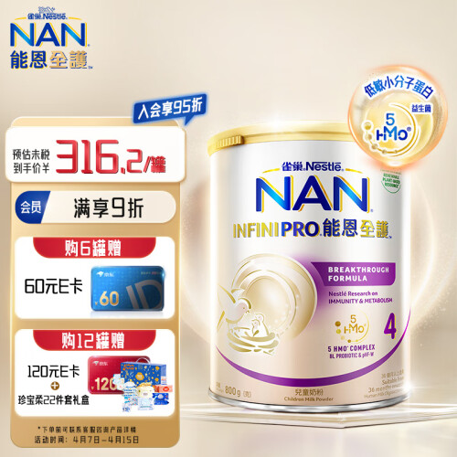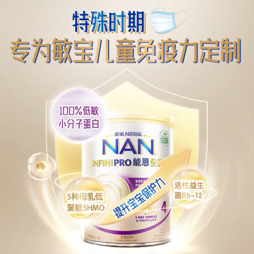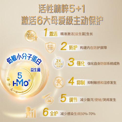 采用突破性下一代低敏配方,含有5种源乳中丰富的珍贵源乳低聚糖5HMO、1种活性益生菌Bb-12,百分百的低敏小分子乳清蛋白,助理宝宝健康发展。