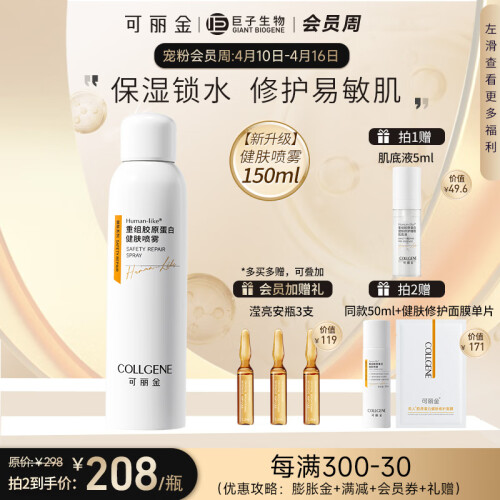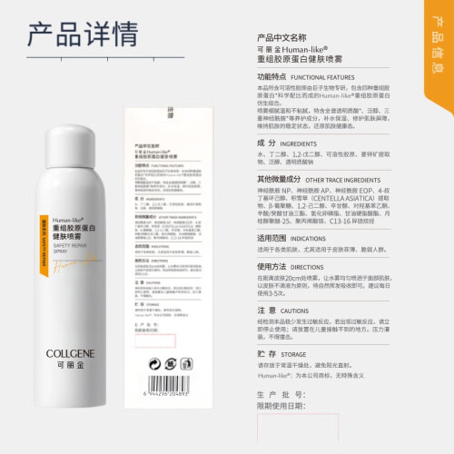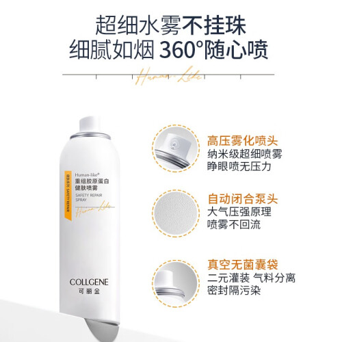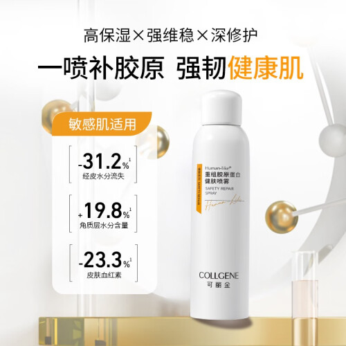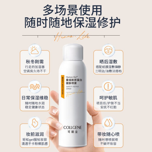 可丽金(COLLGENE)推出的这款喷雾,内含透明质酸钠、可溶性胶原蛋白等成分,可改善肌肤粗糙、泛红、起皮等问题,深入补水保湿,修复受损的肌肤屏障,润泽滋养肌肤。水雾细腻均匀,易于吸收;pH值约为6.5~7.5,温和不刺激。可用于晒后湿敷或定妆等。