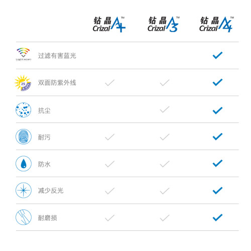 依视路是世界视光行业的领导者之一,起源于1849年法国巴黎,迄今已有170多年的历史。这款钻晶A4系列镜片,可通过有益光线,过滤有害光线,保护眼睛健康。镜片有双面紫外线防护,采用钻晶A系列先进的减反射膜层,提升紫外线防护效果。同时,镜片具有减少反光、防水、耐污、耐磨损、抗尘的功能~