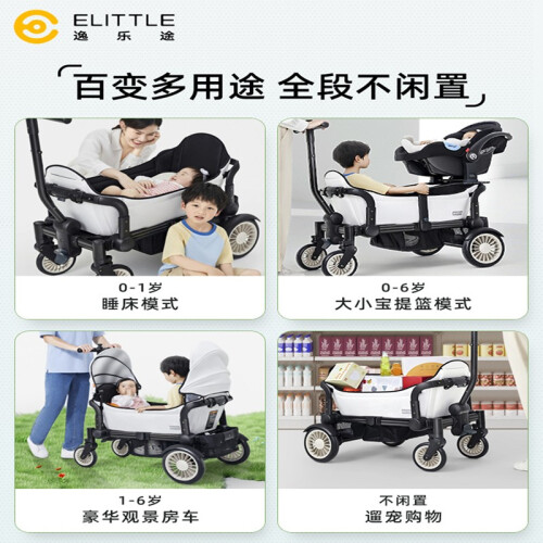 elittle 逸乐途 露营小房车婴儿推车 组合版,在家是睡床,在小区是移动卧铺,外出郊游是观景房车;是车也是床,成长不闲置,宝宝0-1岁不常外出,可以放在客厅或卧室当豪华睡床;航空级高品用材,郊游伴「铝」,铝合金材质加厚耐冲击,耐腐蚀抗氧化;轻简易折收纳灵活,折叠体积小,收纳无负担;出门不挨饿,随时大口吃饭,相对而坐,同桌吃饭;四轮悬浮减震,郊游体验加分,“摆平”路上的坑洼,稳稳的才叫幸福;高品涂银面料,隔绝紫外线,三档调节,篷顶可拆卸,防晒指数UPF50+;刹车须严格,谨防小事故,一脚双刹,前后即停;匠人巧思推拉可调,上坡拉行大轮发力,下坡推行小轮缓冲。