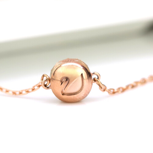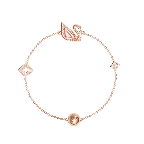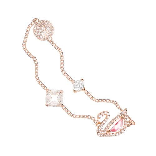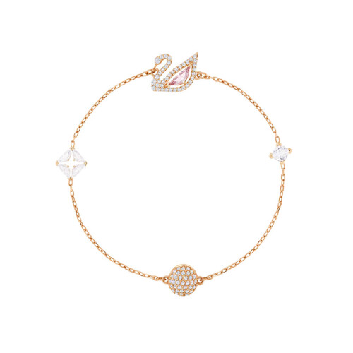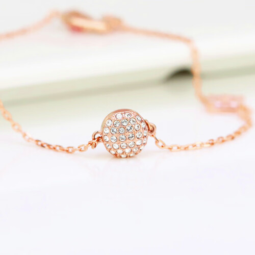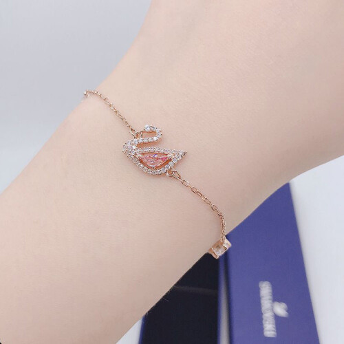 这款精致巧究的镀玫瑰金色手链长度为18cm,天鹅标志装饰以亮丽的粉红色全切割Swarovski仿水晶身躯,搭配简洁俐落的透明色密镶Swarovski仿水晶线条,加上全新的磁扣,彰显出施华洛世奇的傲人设计,这次的设计更偏向于少女风,粉粉嫩嫩,可爱十足。电镀白金色技术,亮丽耐磨有光泽。