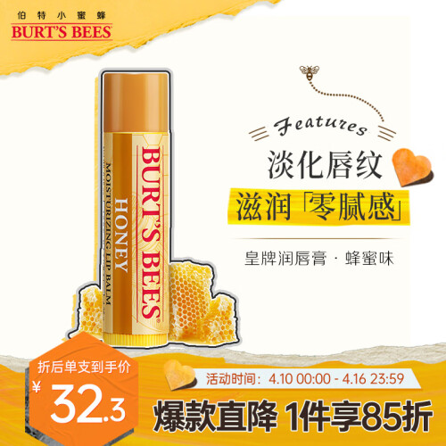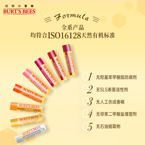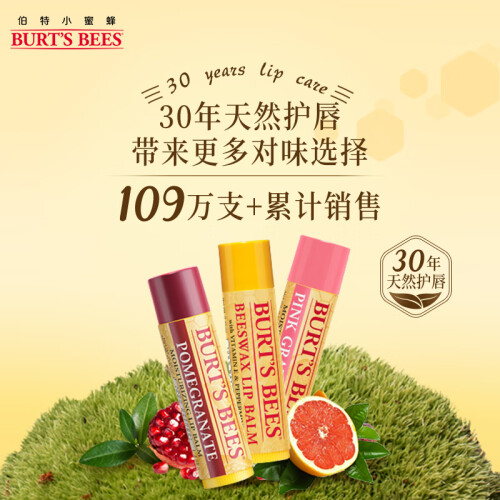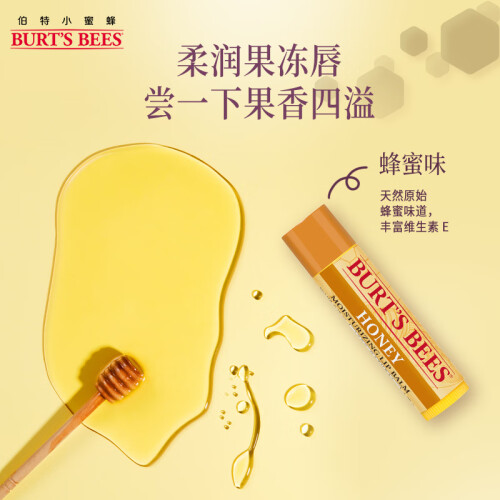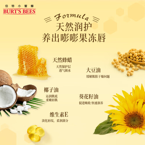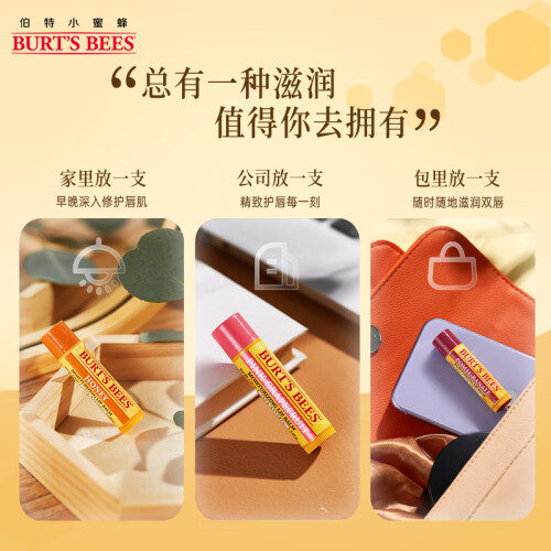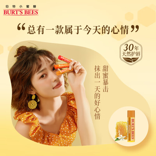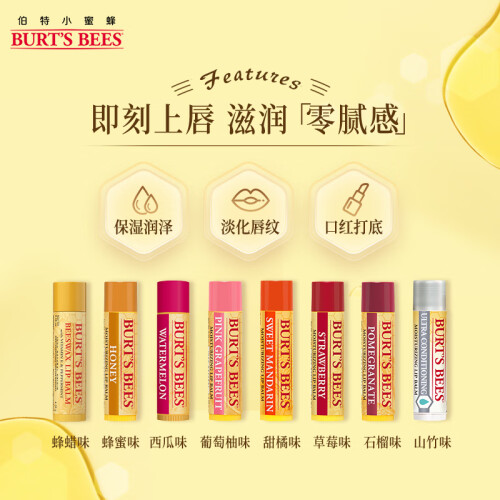 小蜜蜂(BURT'S BEES)推出的这款润唇膏,添加天然蜂蜡、椰子油、大豆油、葵花籽油、维生素E等成分,可帮助缓解干燥和淡化唇纹,滋养和润泽唇部,令双唇丰盈柔润。质地轻薄不粘腻,同时有蜂蜡味、葡萄柚、红石榴、清爽西瓜等香型可选择。