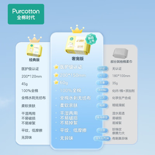 全棉时代诞生于2009年,用天然棉花生产出健康、亲肤、高品质的生活护理用品。这款婴儿棉柔巾采用100%天然棉,具有超柔触感,柔韧不易掉絮,温柔擦拭的同时,呵护宝宝娇嫩肌肤,单张加厚12.5%,加大9%,吸水量和清洁面积提升,擦拭更舒适,欧盟食品级标准,不含荧光剂,可擦拭清洁宝宝眼角、嘴角等敏感部位,宝宝舔咬也不怕,干湿两用,不易掉絮,宝宝和妈妈可以一起使用,12cm*20cm的尺寸刚刚好,不会造成浪费。