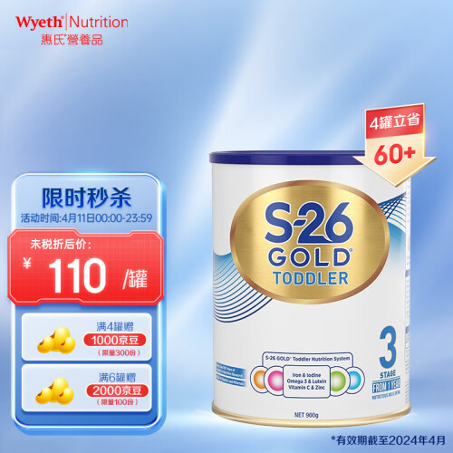 Wyeth 惠氏 S26 Pro A2 婴幼儿奶粉 3段 900g含天然A2 β-酪蛋白,促进肠道健康,消化吸收更好,添加智学因子,黄金配比叶黄素,DHA,胆碱,神经鞘磷脂等,促进大脑发育。
